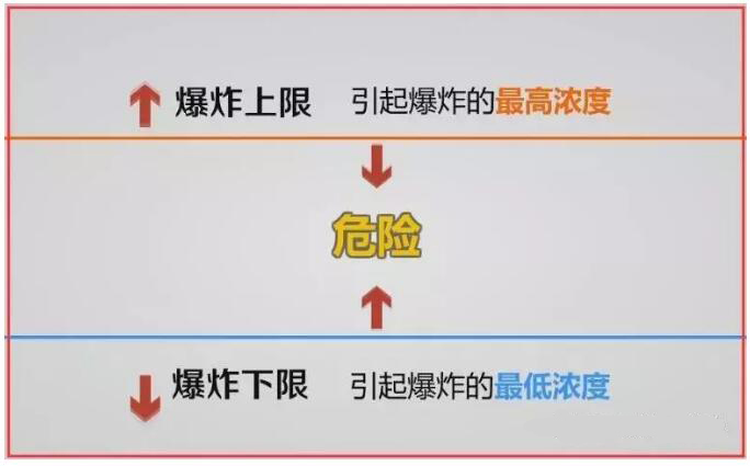 例如常見的VOC:苯,其與空氣混合的爆炸極限為1.5%~9.5%,前后兩個數(shù)字分別稱為爆炸下限和爆炸上限,這兩者有時亦稱為著火下限和著火上限。在低于爆炸下限時不爆炸也不著火;在高于爆炸上限時不會爆炸,但能燃燒。