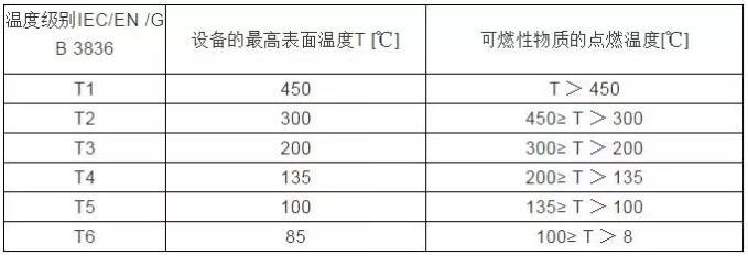 電氣設(shè)備按其最高表面溫度分為T1~T6組,使得對應(yīng)的T1~T6組的電氣設(shè)備的最高表面溫度不能超過對應(yīng)的溫度組別的允許值。溫度組別、設(shè)備表面溫度和可燃性氣體或蒸汽的引燃溫度之間的關(guān)系如下表所示:
