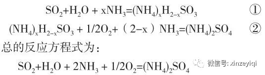氨脫硫技術是基于NH3和SO2在水溶液中的反應。煙氣脫硫塔吸收段中的NH3吸收鍋爐煙氣中的SO2,得到亞硫酸銨或亞硫酸氫銨水溶液。如反應方程式①,在脫硫塔的氧化段,將壓縮空氣吹入氧化段,亞硫酸銨發(fā)生氧化反應生成硫酸銨溶液,參見方程式②。