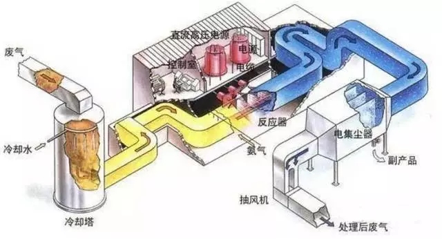 用高能電子束照射煙氣,生成大量的活性物質(zhì),將煙氣中的SO2和氮氧化物氧化為SO3和二氧化氮(NO2),進一步生成H2SO4和硝酸(NaNO3),并被氨(NH3)或石灰石(CaCO3)吸收劑吸收