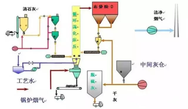 脫硫反應后的產(chǎn)物以干態(tài)粉末形式從分離器中吹出。這種脫硫技術應用石灰石或消石灰做脫硫劑。具有很高的脫硫率及脫硫劑利用率,而且對環(huán)境的影響很小。