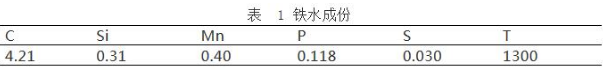 前期渣中加入石灰3 噸,輕燒 3 噸,冷料 3.5 噸,在吹煉到 1800 氧后起槍倒渣,此時的轉爐內鐵水溫度為 1405 度,成份如下表: