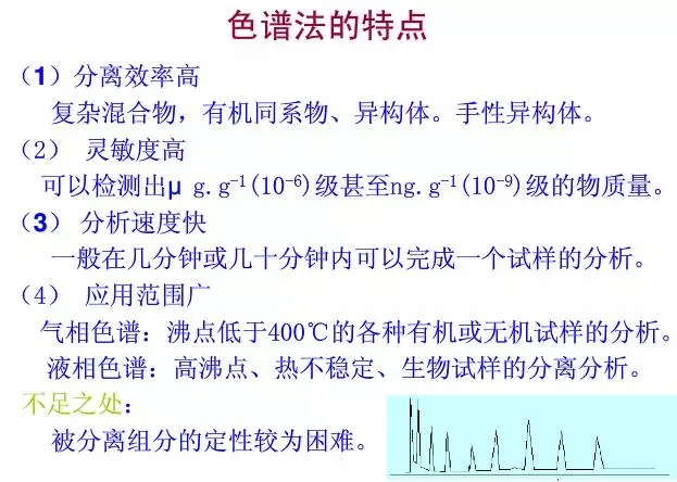 色譜: 是一種兼顧分離與定量分析的手段,可分辨樣品中的不同物質。