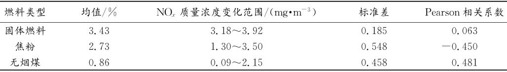 因此,在探討固體燃料類型對NOx排放的影響規律時,將固體燃料比例固定,研究焦粉和無煙煤的比例變化對煙氣NOx排放的影響規律。根據固體燃料比例樣本數據的分布規律,選取具有代表性的固體燃料比例為3.3%~3.5%的樣本數據進行相關性分析研究,結果見表3。