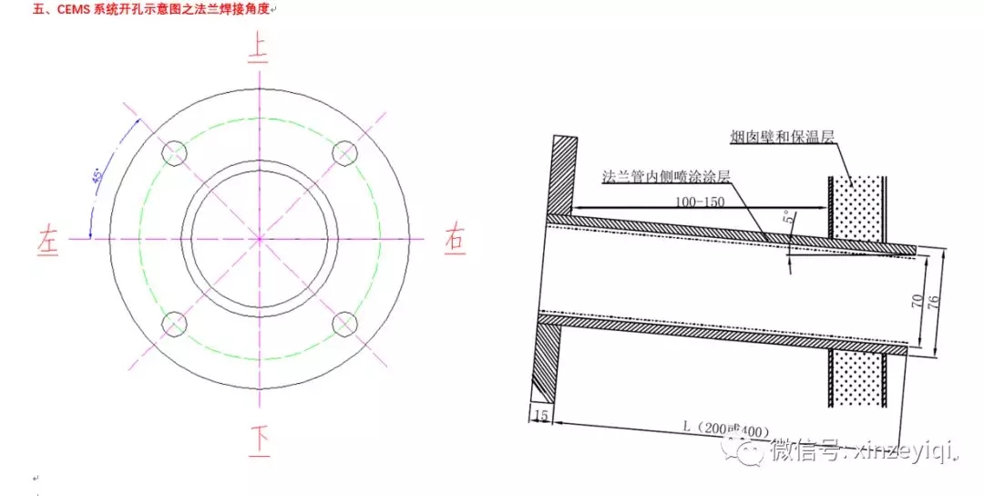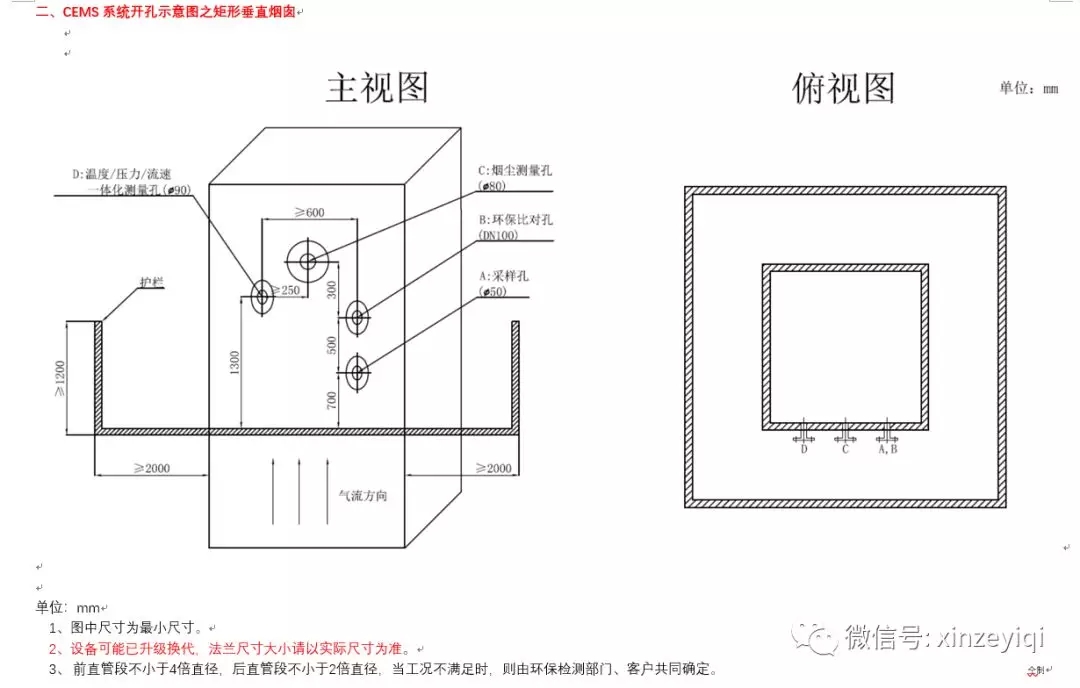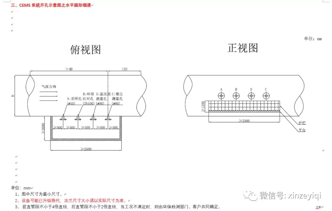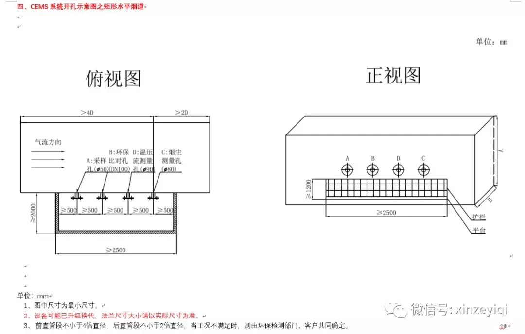 注意:開孔位置及法蘭之間的距離尺寸可以按照開孔示意圖來(lái)開孔施工,開孔的大小要根據(jù)煙氣在線監(jiān)測(cè)設(shè)備生產(chǎn)廠家的實(shí)際法蘭大小以及盲管直徑的粗細(xì)來(lái)施工。